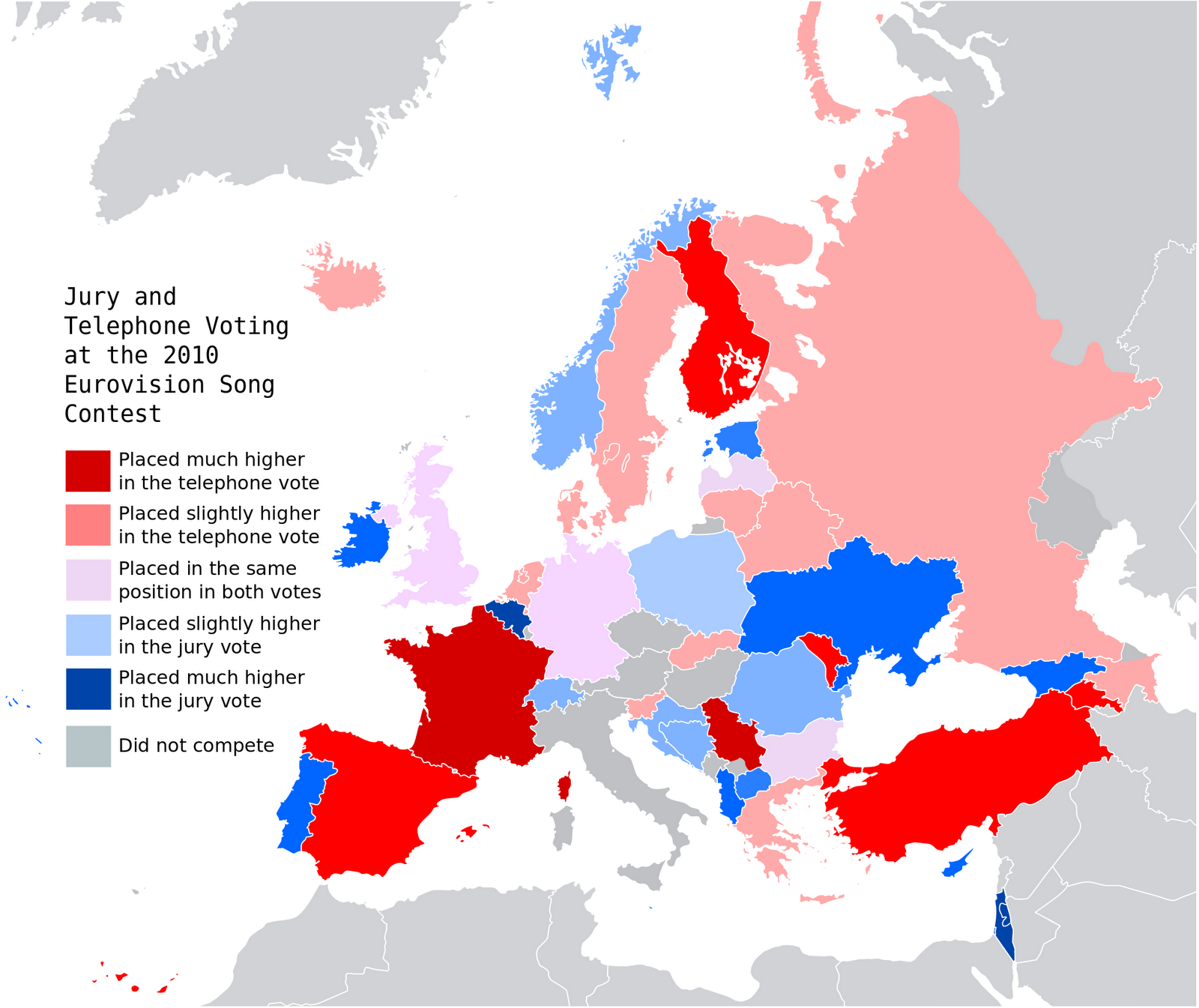 While the map suggests a link between geography and televote performance is patchy at best, there seems to be a stronger link with the type of music. Up-tempo numbers, like that of France Serbia and Moldova seem to be more popular with televoters, while juries seem to prefer the ballady fayre of Israel, Belgium and Ireland.